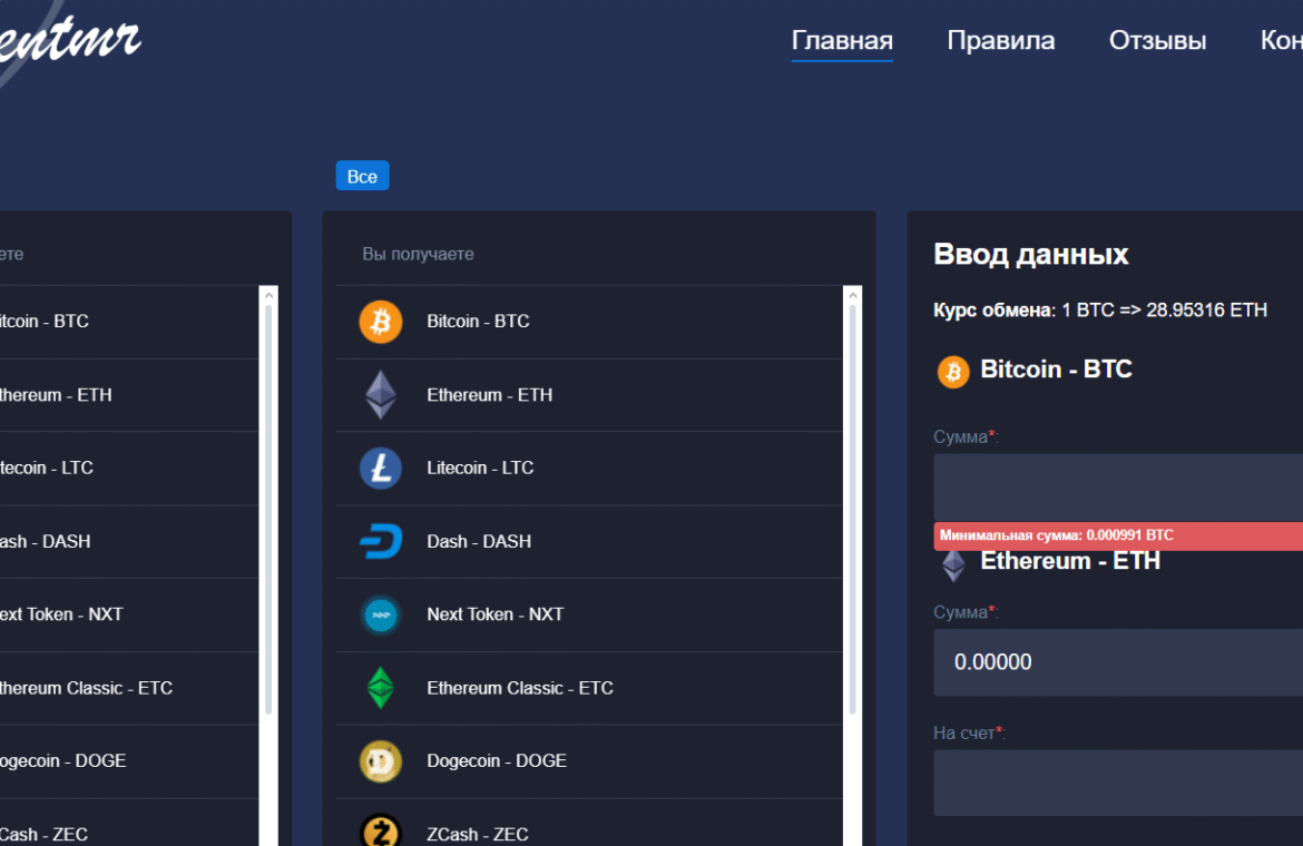 • форма заявки: вы «отдаёте» одну валюту и «получаете» другую, есть курс, минимум по сумме и поля для e-mail, телефона и ФИО