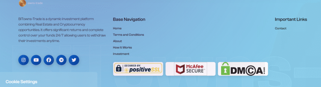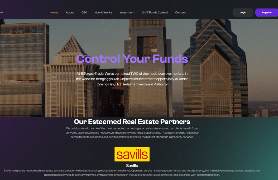 - Подлинность партнерств: Официальные сайты указанных корпораций (например, Savills) не содержат упоминаний о сотрудничестве с платформой BiTowns Trade. Как правило, такие заявления используются для придания веса проекту в глазах новичков.