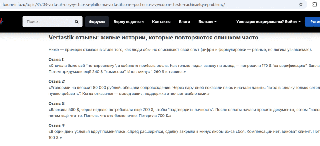 В интернете можно найти различные отзывы о Vertastik.com, в которых пользователи делятся личным опытом взаимодействия с платформой. Среди упоминаемых моментов встречаются: