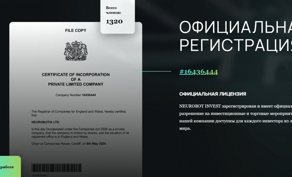 Компания зарегистрирована как NEUROBOTIK LTD (#16436444) на Companies House — активна с 8 мая 2025, адрес совпадает, но SIC-коды 58290 (software publishing) и 62020 (IT consultancy), без упоминания инвестиций или трейдинга. Нет лицензии FCA/CySEC — поиск в реестрах отрицательный. В финансовом праве отсутствие регуляции означает нулевую защиту в спорах. ScamAdviser отмечает: молодой сайт, подозрительный сервер, high-risk крипто. Рекомендуем проверять на ЦБ РФ для РФ-ориентированных, или SEC глобально.